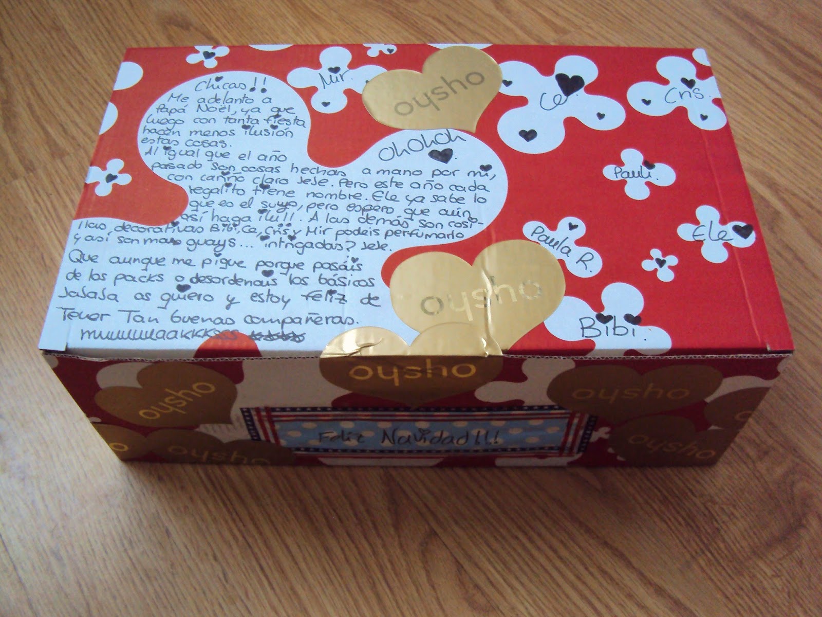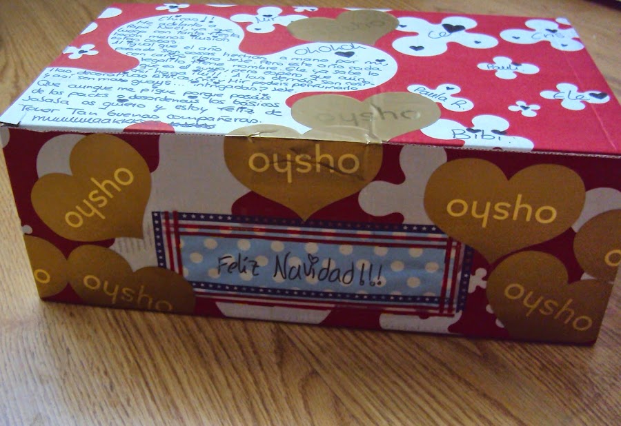 El empaquetado es mejorable (lo se). Aproveche una caja de los zapatos del uniforme de mi pareja (Gus), ya que tenía unas formas que me parecían adecuadas para escribir mensajes a mis compis.
