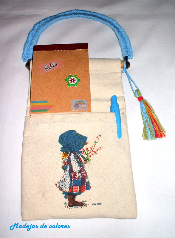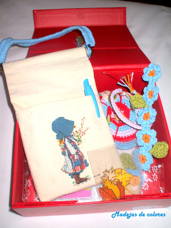 Vamos a verlos uno a uno, como esta bolsita con mi querida Holly Hobbie, que ella personalizó, decorando el asa para colgar con ganchillo y un borlón de colores. Dentro venía una libreta pequeña y bolígrafo. En una palabra "Adorable".