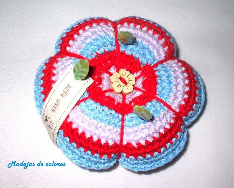 Con la misma técnica, un precioso y alegre acerico, lástima que las fotos una vez más no hagan justicia. Prendida en una de las alfileres con hojitas, una etiqueta hand made.