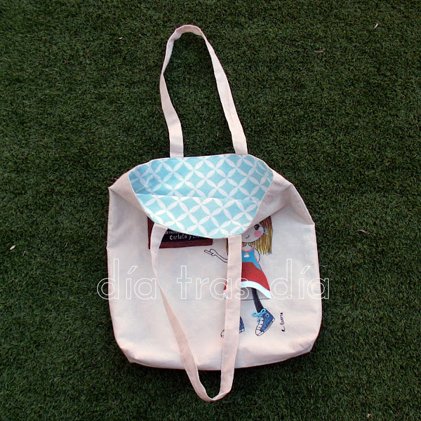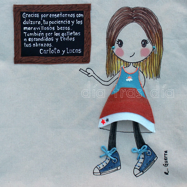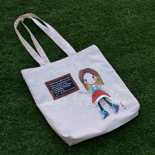 Para la seño Vero eligió un bolso personalizado con sus rasgos y con el uniforme del cole. Así es como quedó: