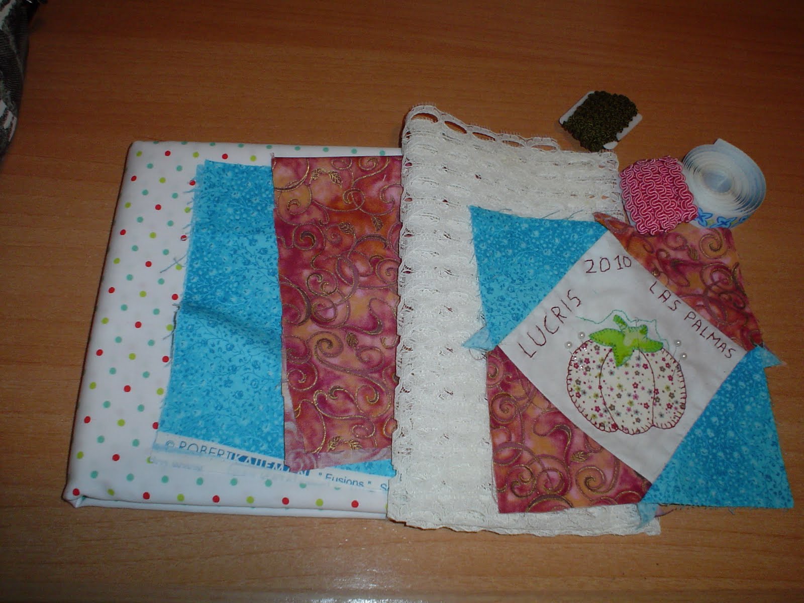Este fue el motivo del envio el bloque. ¿Precioso verdad?, y como dice que no esta segura me envia un trozo de las telas que ha utilizado por si no esta bien. Como veis Tambien hay unas cintas y pasamaneria