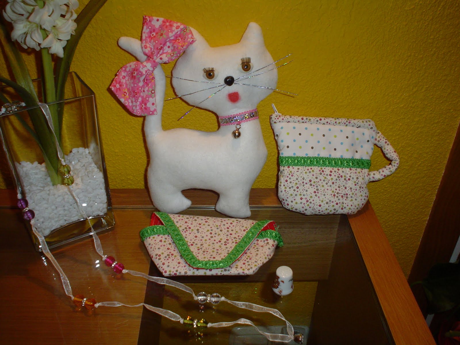 Y mirad que monada de gatito, una tacita para las infusiones, un estuche, un dedal como no de gran canaria y este collar . A que os gusta ¿verdad?, pos a mi me ha encantado .