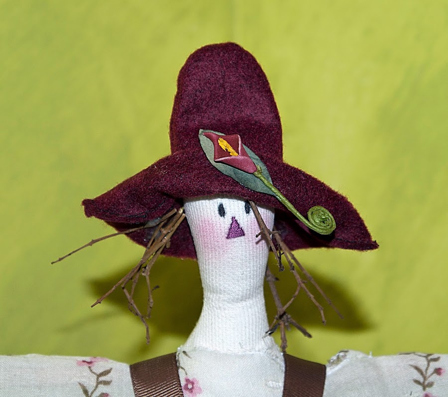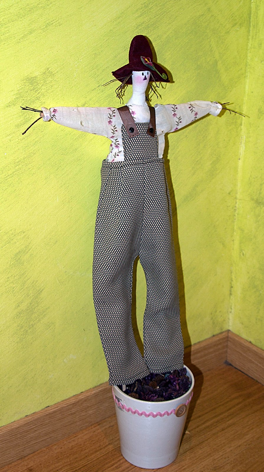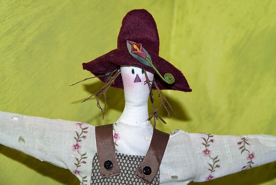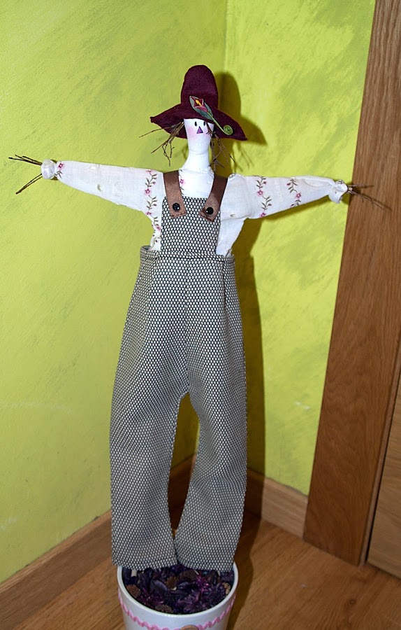 Lo siguiente, este espantapájaros de la serie de libro de Tildas que tengo, este fue para mi hermano, para colocarlo en una planta en el jardín o en la terraza ;) no me digáis que no es coquetísimo, con su pelo de ramitas y su peto grajeril...<3 p="">
