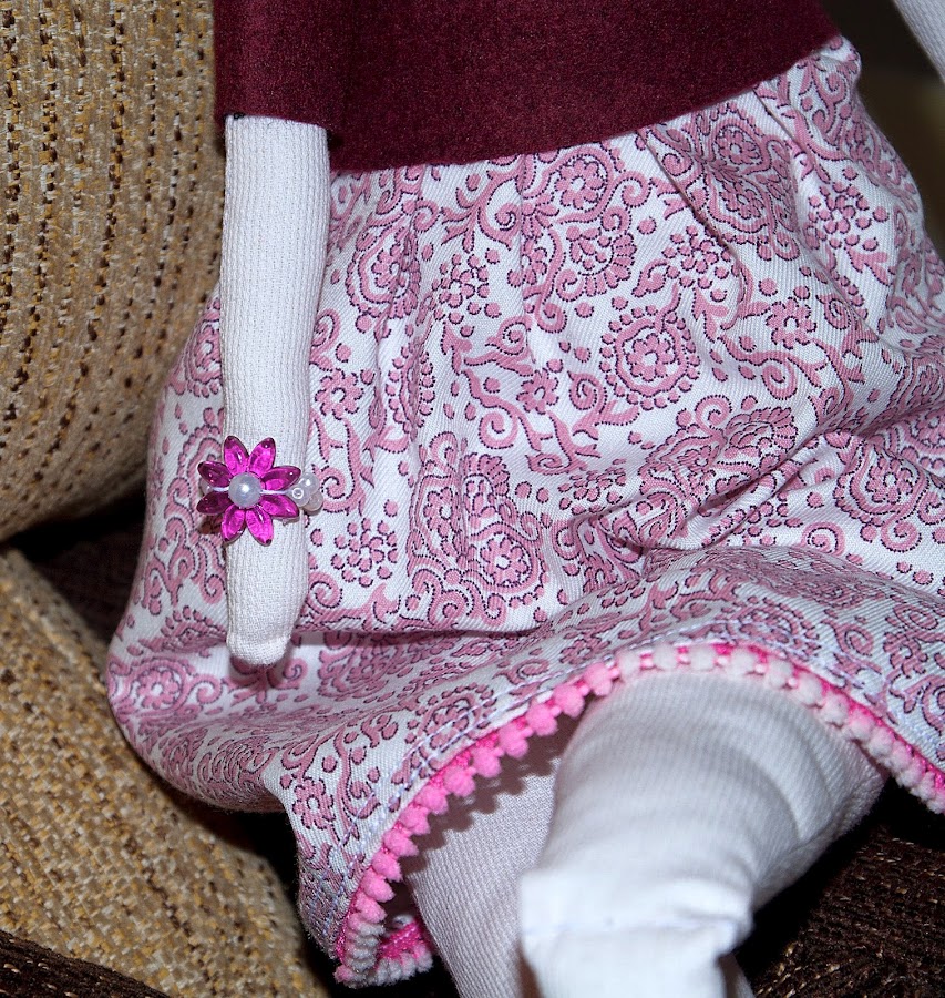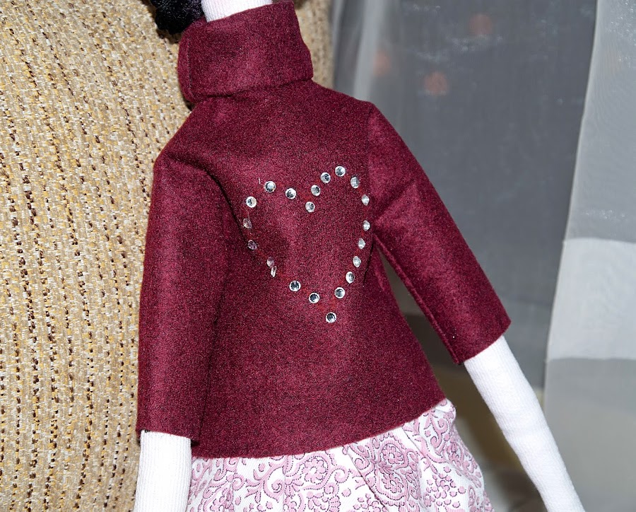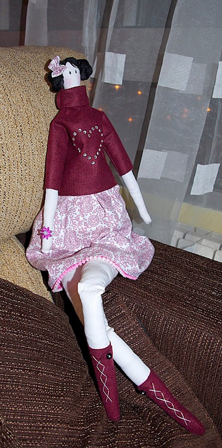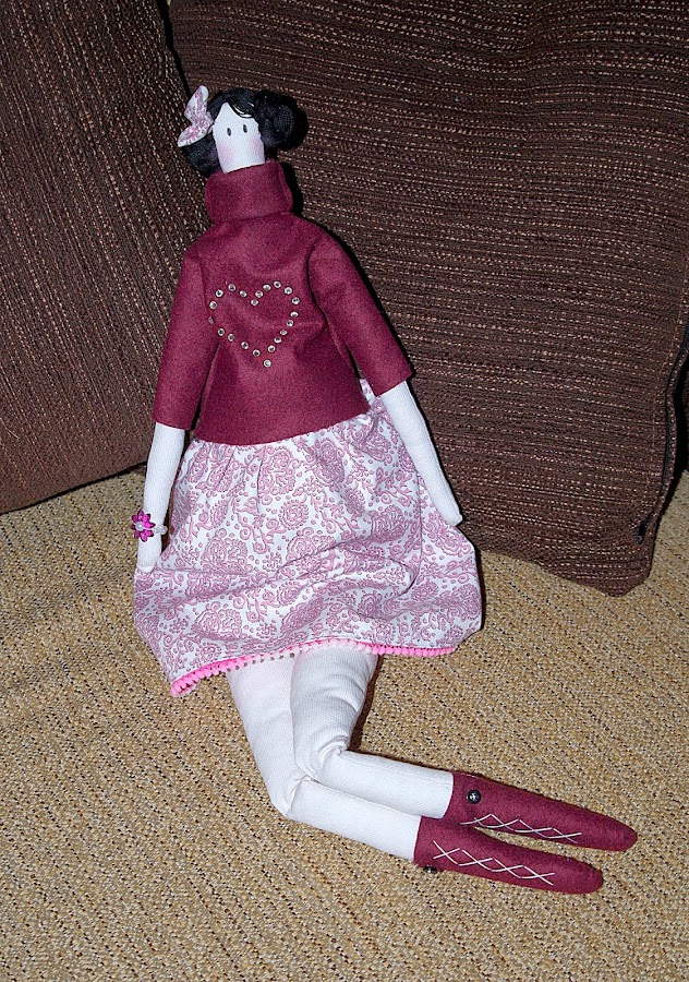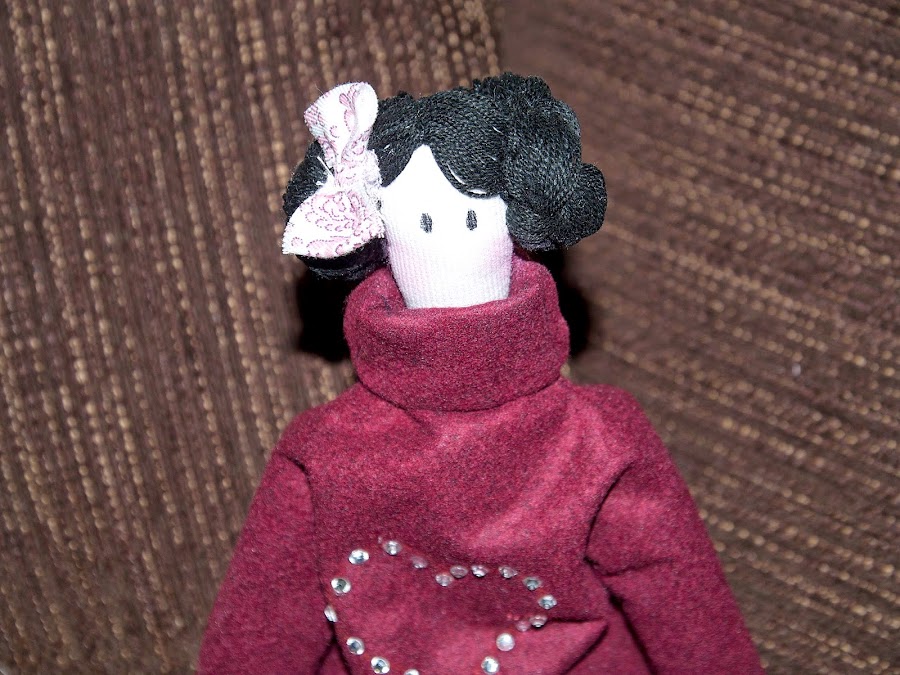 Y por último esta preciosa Tilda para mi madre, estas muñecas me encantan, la base es un poco fea pero una vez que las vistes y las haces el pelo y la cara, quedan tan delicadas y tan elegantes, tan estilosas ellas con sus piernas cruzadas, puedes vestirlas modernas, clásicas, con puntillas a tope, sombreros bolsos...son tremenda mente agradecidas a la creatividad que quieras emplear en su confección...A esta la hice un jersey de fieltro y le pegue piedras de strass con una maquinita que me compro mi madre, le puse botas con una trabilla y un mini botón, la puse el pelo de lana negra y la peine a lo princesa Leia, la hice una pulsera de perlas, y pense hacerle un bolso pero el tiempo iba en mi contra...quiero mas!!!!