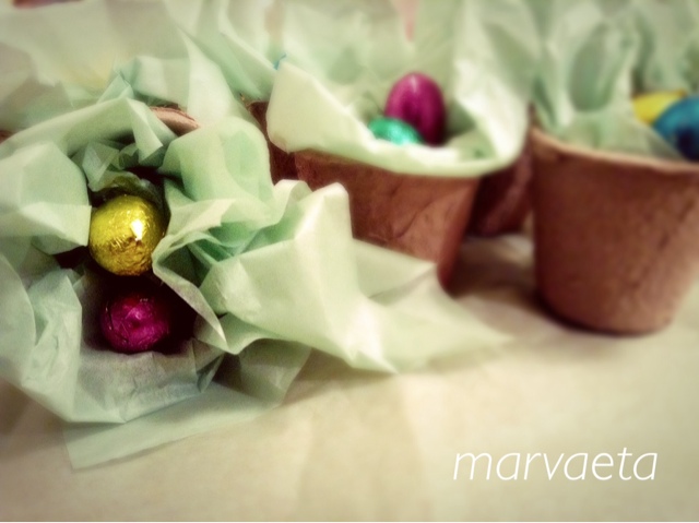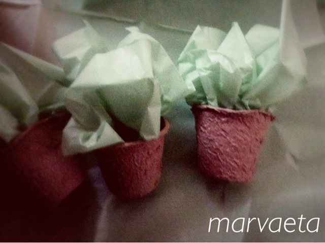En las macetitas de cartón (10 por 1 euro) hemos puesto un hoja de papel de seda verde agua (como si fuera hierba).