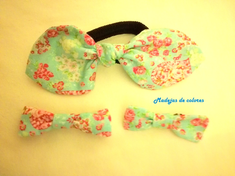 Con la misma tela, le hice un conjunto de coletero y pinzas para el pelo.