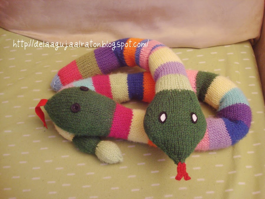 Con el mismo patrón que la serpiente multicolor, he hecho otra igual, es para mi ahijada, que tiene 3 años, cuando vio la mía le encantó, y la he hecho una, es más corta para que no la arrastre por el suelo. Los ojos son de fieltro, porque con botones me da miedo que se caigan y se los trague.