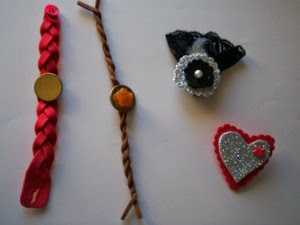 Primero unas pulseras en goma eva en forma de trenza, (la roja está hecha con 3 tiras y la marrón en 2) si quereis podeis añadirle algún botón, abalorio,etc que tengáis pero sin nada también son bonitas. Luego tenemos 2 broches el corazón es todo en goma eva y el otro es goma eva, encaje negro y un pendiente que como se me perdió la pareja lo he utilizado como perlita.