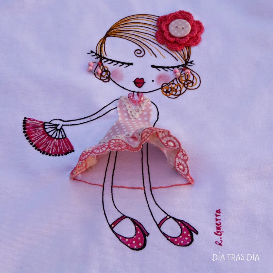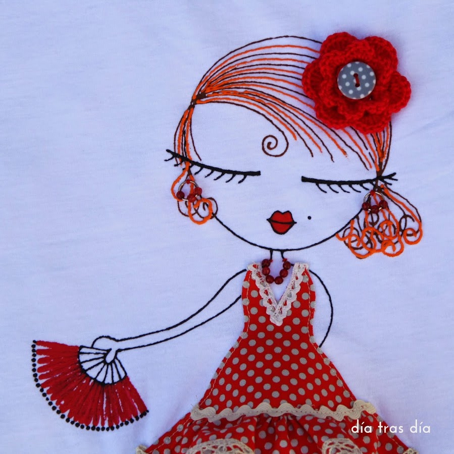 Así que ya que no iba a poder pasar con ella ese día tan especial, le hice una camiseta de un modelo que se que ella tenía ganas de tener: una Ro-ro flamenca. Pero esta vez fue un poco personalizada y, al igual que la de Nora, el pelo lo hice en su color. Así que aquí tenemos la primera Ro-ro flamenca pelirroja :-D :