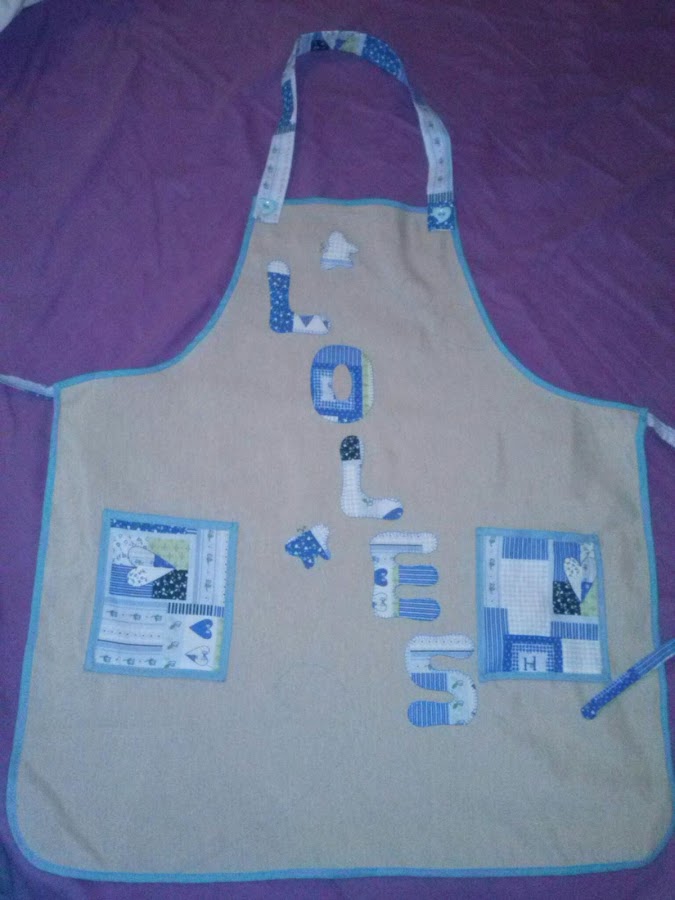 Por ultimo el delantal de mi hermana, es de loneta y le puse su nombre con apliques y unas mariposas, muy primaveral. Qué mejor halago que el que te digan que da pena ponérselo!