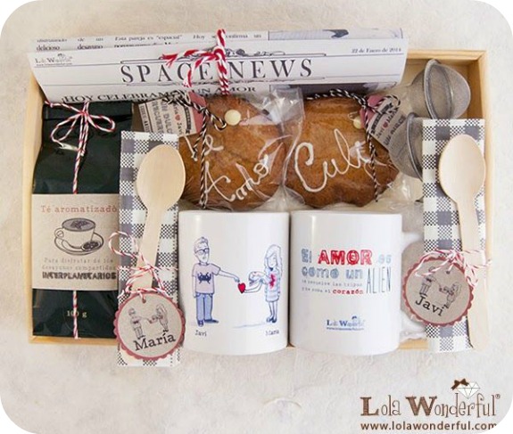 Lo suyo es que lo hagas tu. Prepara unas galletas o un bizcocho que le guste a tu pareja, añade café o te, un par de tazas, un par de cucharas de madera con unas servilletas bonitas todo ello dentro de una caja molona bien empaquetado todo y tendrás el regalo perfecto. Sino, siempre tienes la posibilidad de encargarlo, pero ya no sera handmade y gastaras mas dinero...