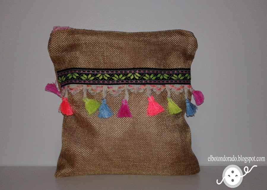 Como a mi hija le encantan los bolsos y con todos los que tiene nunca son los suficientes, se le antojó uno con borlas, así que utilicé tela de saco para hacérselo y añadí una cinta.