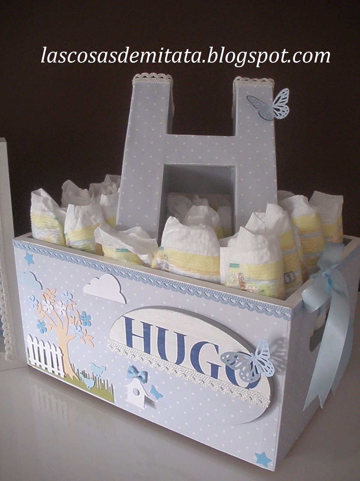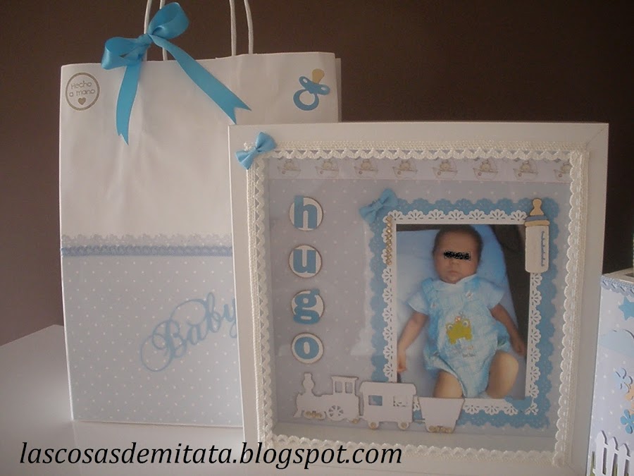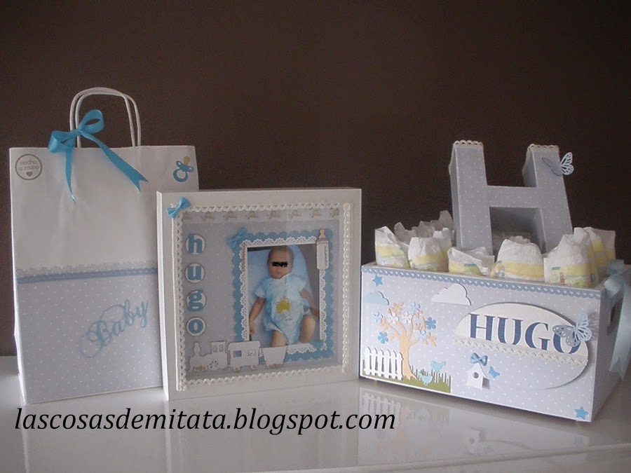 Para el pequeño Hugo, que nació hace sólo un par de meses, y a quien fui a conocer hace poco, le quise regalar cositas hechas por mi. Le lleve un cuadrito infantil con su foto para decorar su habitación, un cajón de madera donde guardar facilmente los pañales y tenerlos a mano y su inicial en cartón.