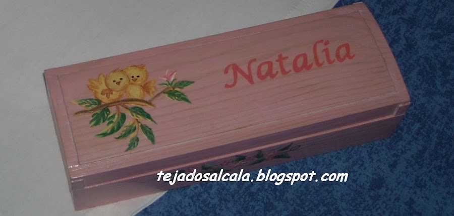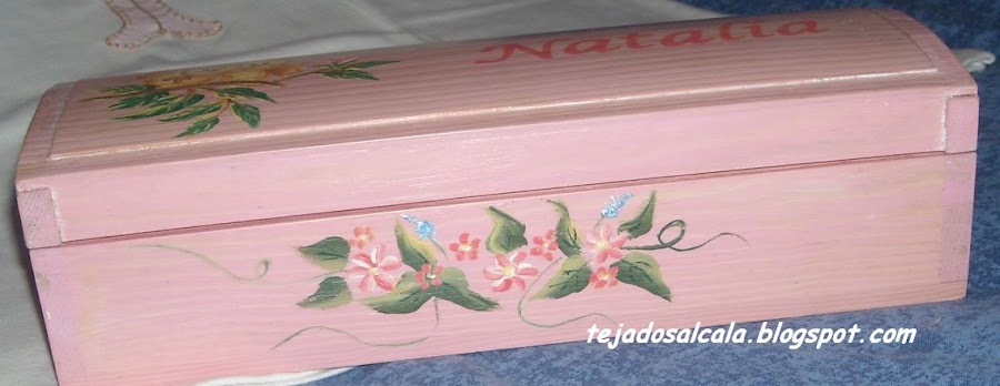 Y finalmente esta es una caja personalizada con su nombre. Teñí la madera natural con una aguada de rosa chicle. Le pinté unos motivos a mano alzada y su nombre que saqué del worArt.