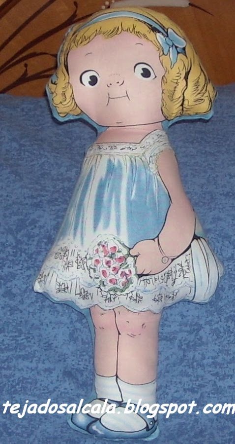 Esta es una muñeca recortable. Es de un panel que viene con varias muñecas que tienen delantera y trasera (se me ha olvidado hacerle la foto) se recortan y se unen y ya tenemos una muñeca de unos 35 cm. para jugar, de cojín, o para dormir con ella.
