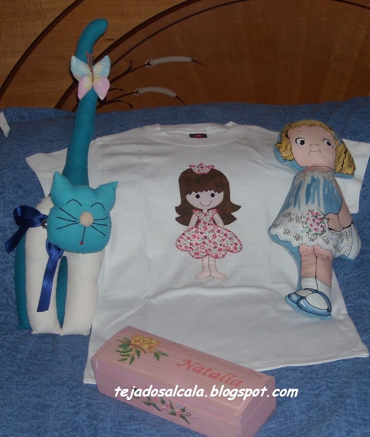Estos son los regalos que le hice a mi sobrina Natalia. Digo hice por que luego ella no estaba muy conforme con sus regalos y ha cambiado el gato. No le gustaba el azul y me lo ha cambiado por el mio, en tonos granates. Lo demás le ha encantado.