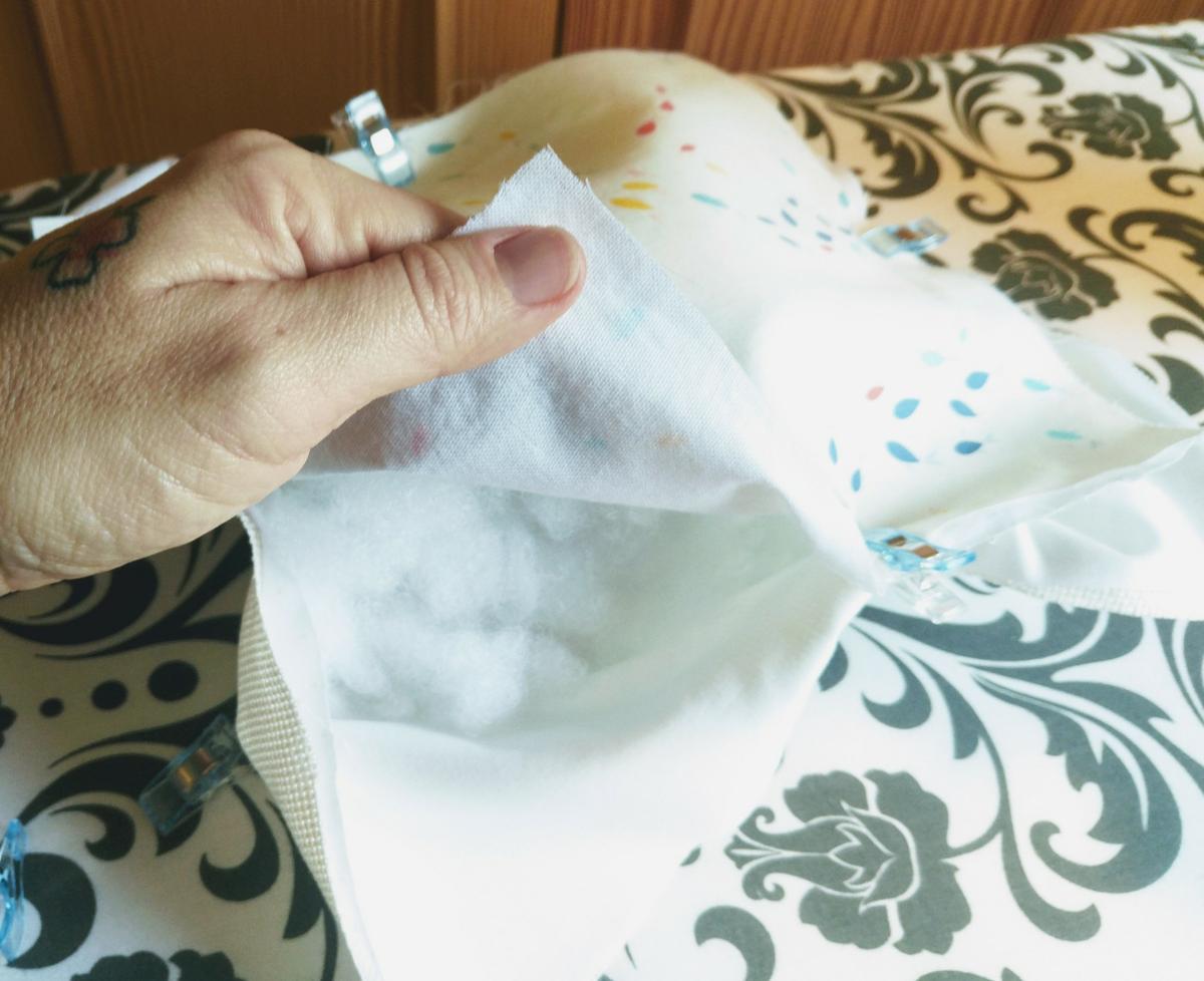Ahora es cuando tiene sentido a que la tela de arriba sea más grande que la de abajo, para hacernos más fácil la tarea de meter el relleno.