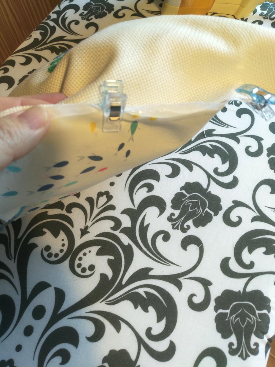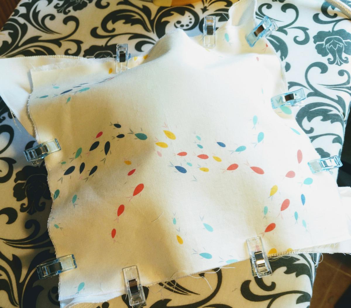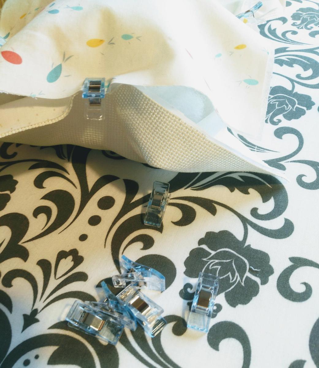 Pues nos vamos a ayudar de unas pincitas de costura, e iremos uniendo los lados de las telas de arriba y de los de abajo de forma que cuadre.