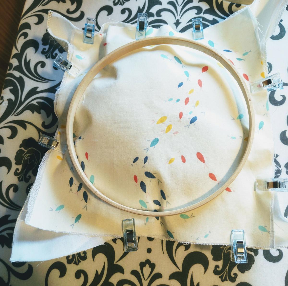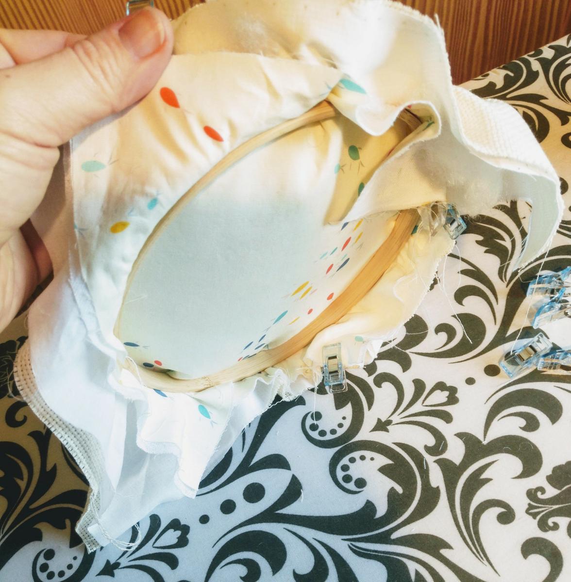 Como veis he dejado mucha tela alrededor del bastido, porque como luego lo vamos a rellenar con guata, tiene que tener tela de sobra. ¿Cuánto más? Pues un poco a ojo; luego si nos sobra mucho, lo cortamos y listo.