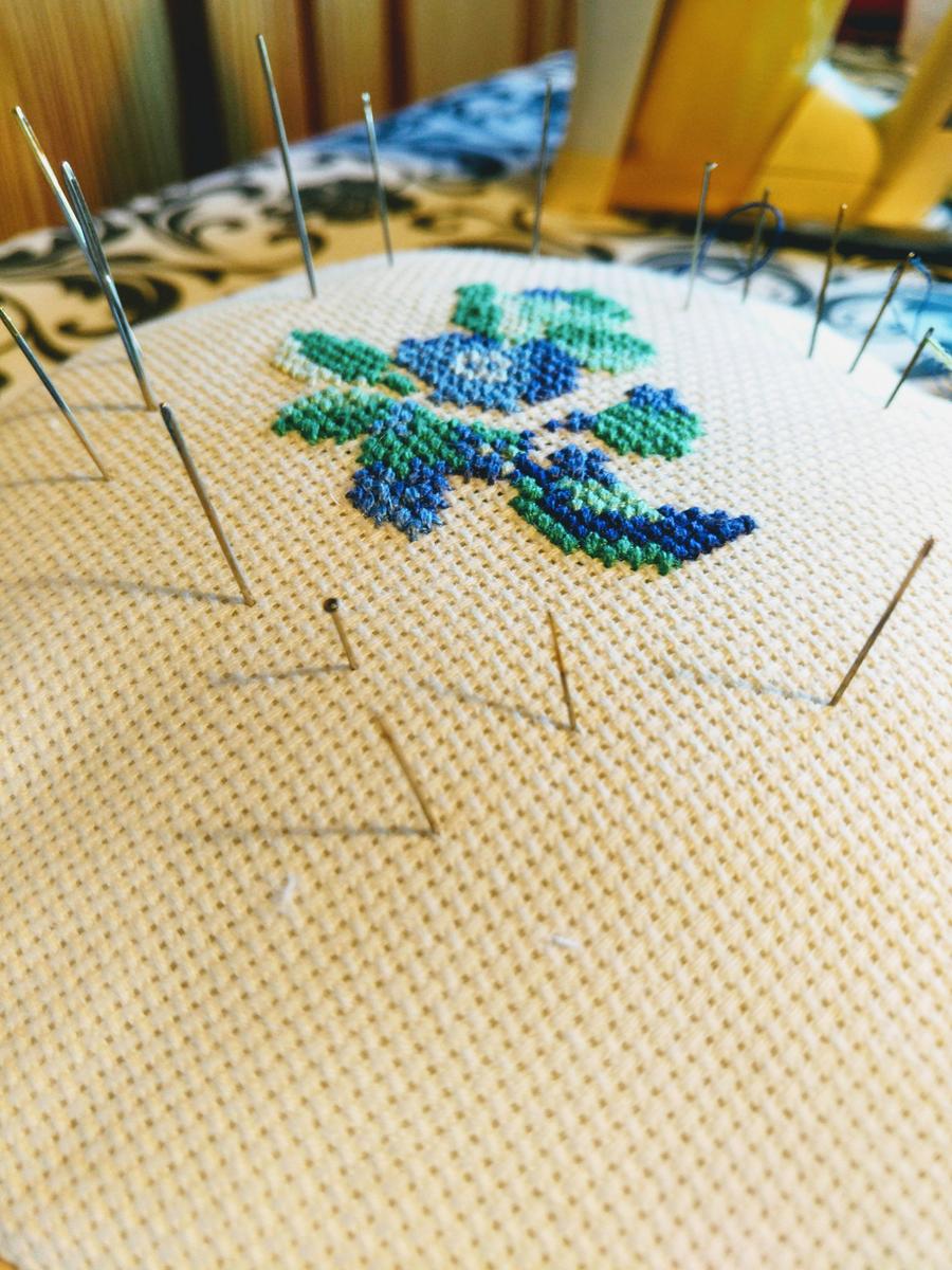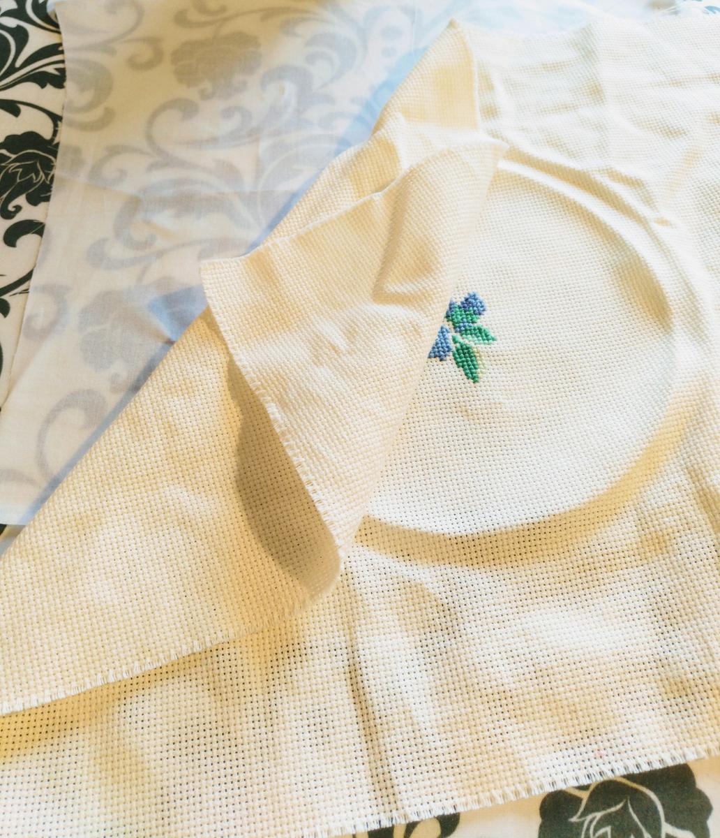 Una vez que tenemos hecho el motivo en la tela, abrimos el bastidor, sacamos la labor de punto de cruz y comenzamos a preparar el resto del material