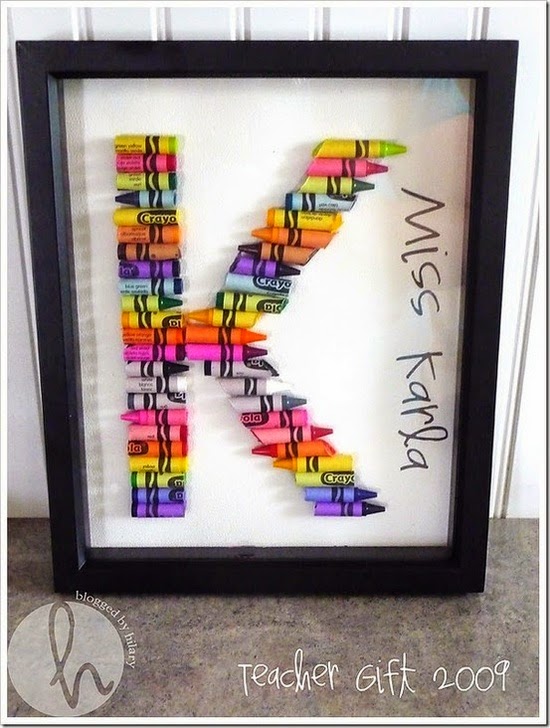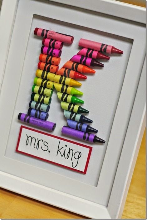 Un cuadro con la inicial del nombre de la maestra con ceras de colores! Me parece muy original y fácil de hacer