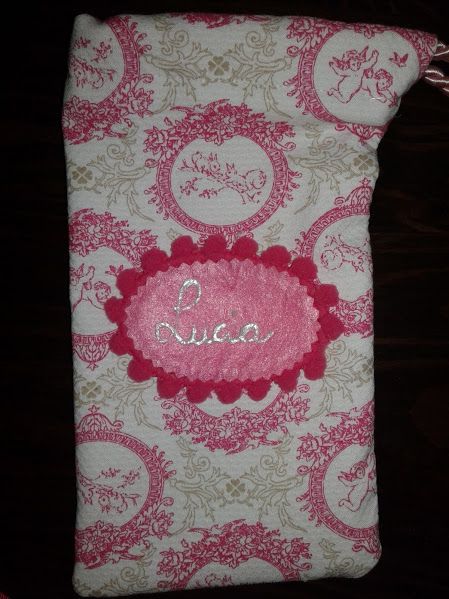 Esta bolsa la hice, con un retal de tela que tenia guardado de una mochila que le hice a mi hija.la idea es para guardar el chupe. Se va a llamar Lucia como mi hija. así que le puse el nombre tambien con pintura en 3D