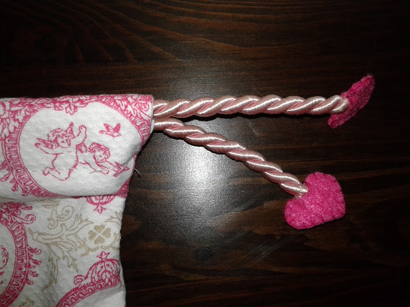 El detalle del asa, cordón rosa y rematado con dos corazones en fieltro