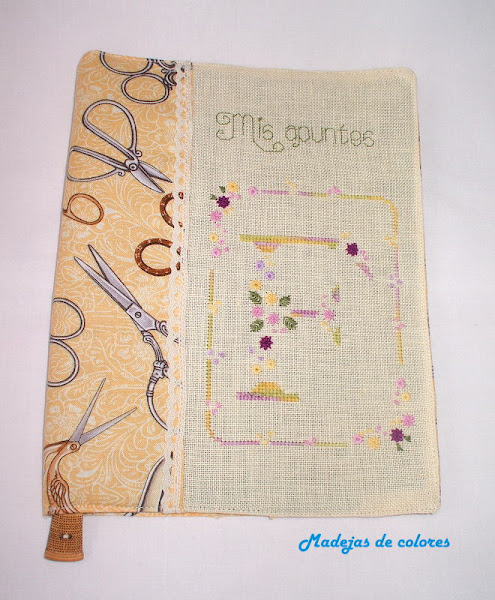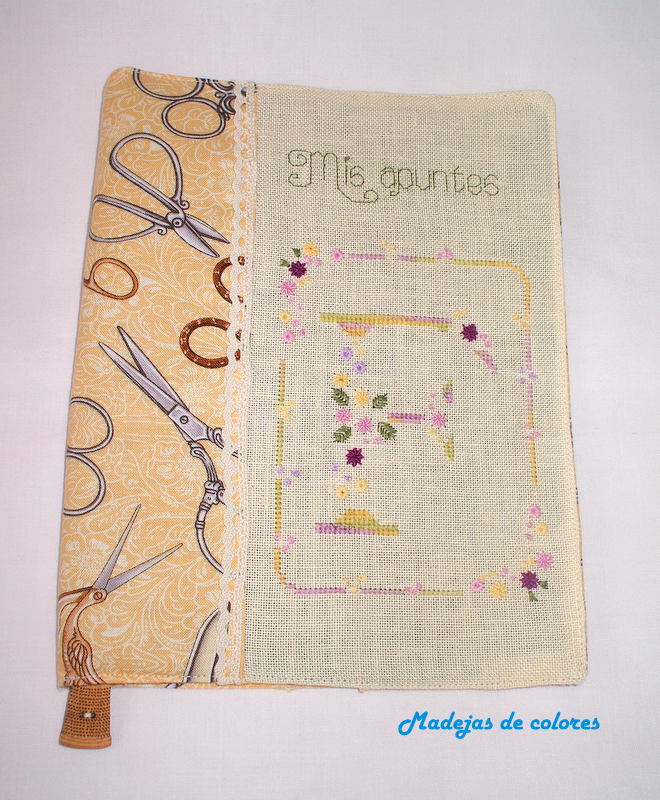 Aún así me decidí por una funda para su cuaderno de labores, realizada a punto de cruz con su inicial, combinada con tela estampada y puntilla en la unión.