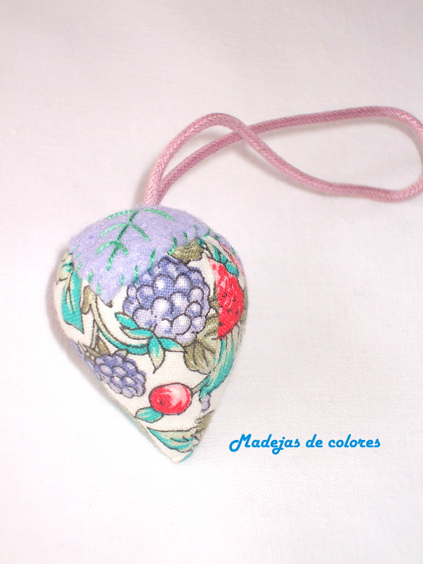 Una fresa, realizada en su color favorito, a la que puede dar diferentes usos ( buscatijeras, llavero, adorno de bolso, para colgar de pomo de puertas...).