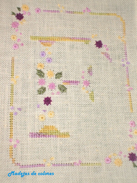 La bordé con una madeja teñida por mi, en tonos malvas, verdes y amarillos. Es un diseño de "Atalie", se que a ella le gusta mucho, por su delicadeza y diferentes puntos de bordados.
