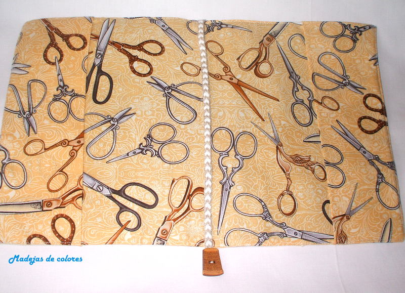En su interior, una tela muy apropiada para su función, llena de tijeras. Y como marcador, una cinta llena de corazones, en cuyo extremo le puse un botón de madera en forma de dedal.