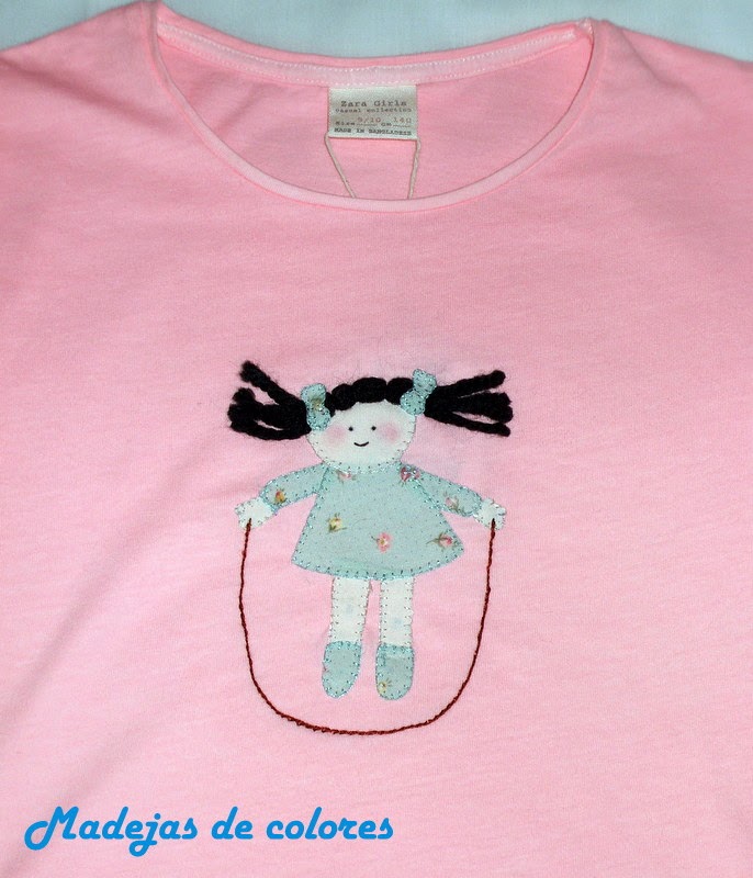 Compré una camiseta en color palo rosa y, le puse con aplicaciones a festón, esta muñeca saltando a la comba.