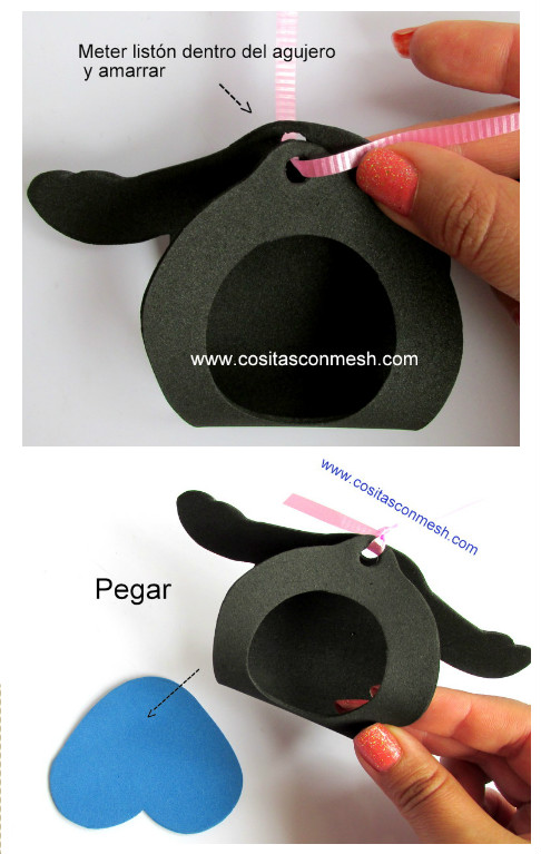 5.- Pegamos el cuerpo sobre la base, el cual es un corazón en foami color azul.