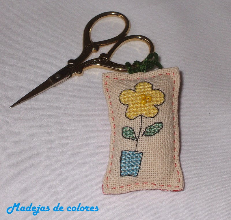 Este es el guardagujas, en el centro de la flor le puse una piedrita amarilla y un botón en forma de abeja, regalo de Loly, que le vino ideal.