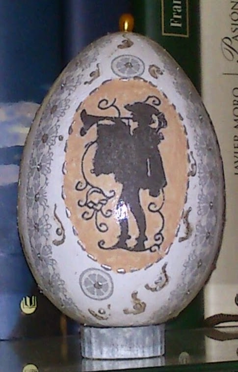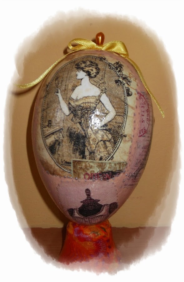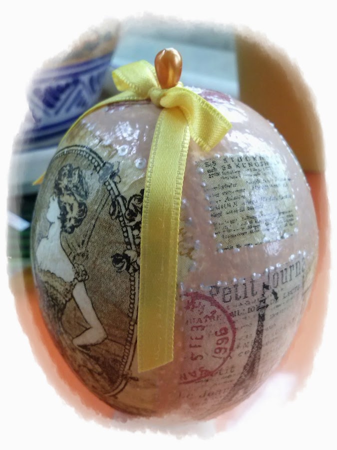 Todo está pegado con medium decoupage( podéis emplear igualmente cola blanca o alkil) y rematado con barniz brillante al agua( ojo, nunca uséis barniz o pintura que no sean al agua en el poliespan, porque se comen materialmente el huevo, lo destruye. Doy fe)