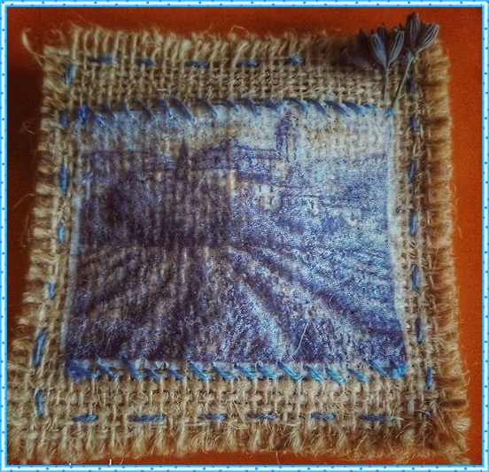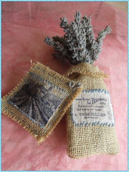 Hice unos pequeños saquitos perfumados,(los rellené de las flores de lavanda) con tela de saco o arpillería, y los adorné con decoupage.