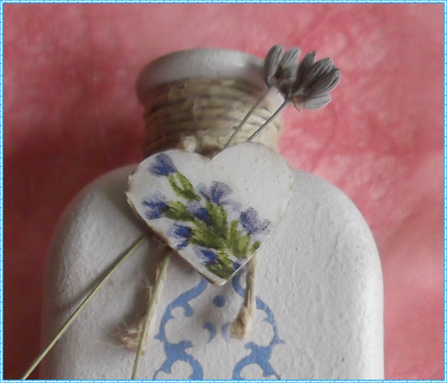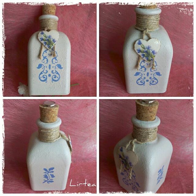 Una pequeña botella, que pinté con pintura tipo tiza, en color blanco roto y que lleva un estarcido en todas las caras, junto con un pequeño corazón que hice en cartón, decoupage y cubierto con glossy para darle relieve y brillo.
