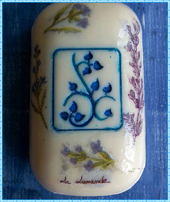 Un jabón con decoupage y pintado con vitral. Aproveche la imagen que llevaba grabada el jabón y la pinté con pintura vitral.