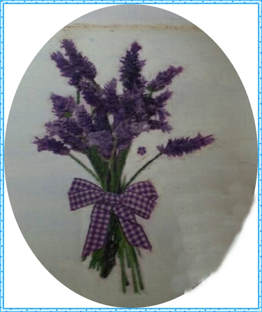 Lleva un decoupage, realizado con servilleta, de un ramillete de lavanda.