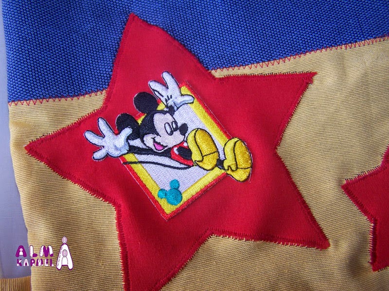 Mochila de Mickey Mouse, su pequeño dueño está encantado, y hecho el diseño para él, jugando con los colores y complementos que quería que aparecieran en ella. El resultado me encanta, es divertida y muy colorida.