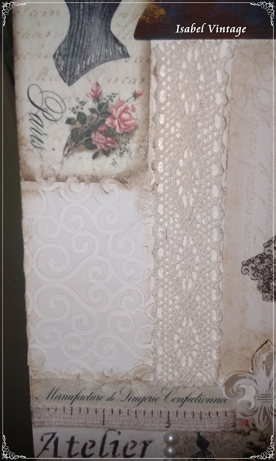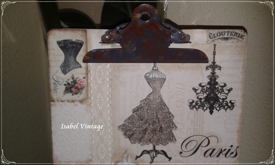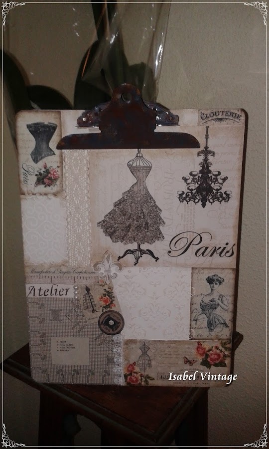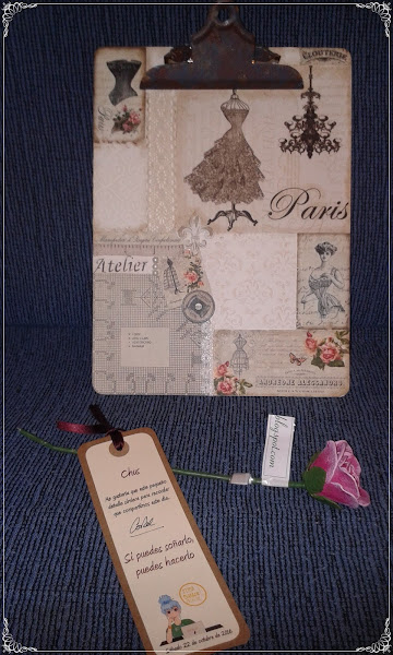 En la comida realizamos un amigo invisible especial, cada una llevamos un regalo que no sabíamos a quién iba a parar. Recibí el regalo de parte de Isabel del blog Isabel Vintage, supongo que la conoceréis de sobra, es una artesana excepcional. Me regaló un clipboard decorado precioso!!!!!. Ya admiraba yo sus trabajos pero tener uno en la mano, es impresionante. He sacado bastantes fotos para que veáis todos los detalles que son muchos y alucinantes.