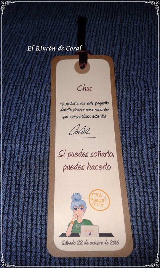 Coral nos regaló un marcapáginas precioso con el logo de la Quedada y personalizado con nuestro nombre, genial, verdad?