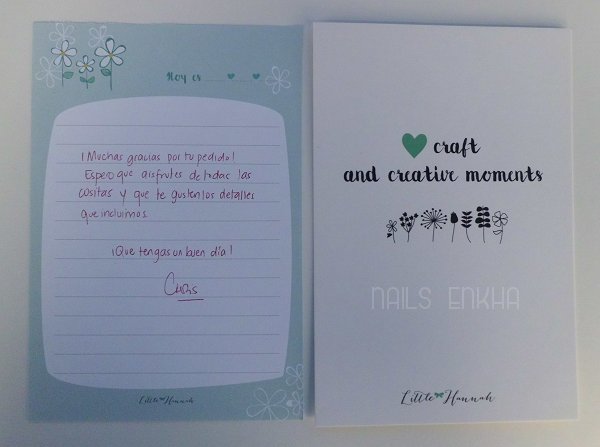 Al abrirla me encuentro con unos regalitos que son dos hojas para notas y unas pegatinas de la colección mensajes, además de una tarjeta con su logo y una nota dando las gracias por el pedido. Os lo enseño.