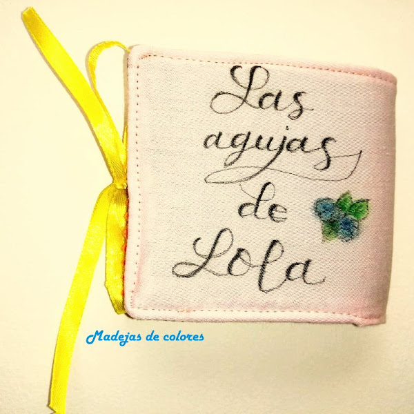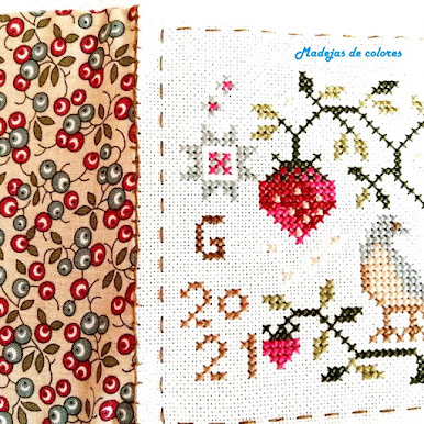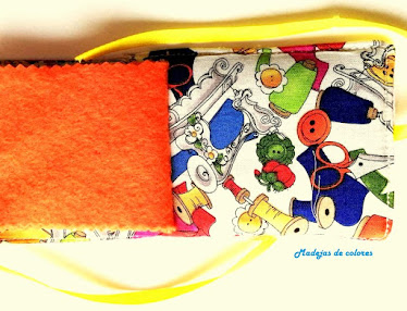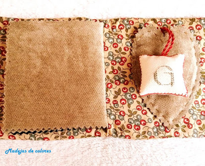 Y su interior, el cual combiné con una tela con motivos frutales, a juego con la fresa de labor y con la misma lana donde se pincha las agujas, un corazón donde guardar unas tijeras pequeñas. En la trasera del busca-tijeras, la inicial de la obsequiada, que también puse en el exterior, sobre la fecha.