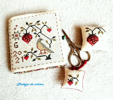 Otro conjunto que me encanta a punto de cruz, con un precioso diseño de "Black Bird Desing". Consta de guarda-agujas, alfiletero y buscatijeras.