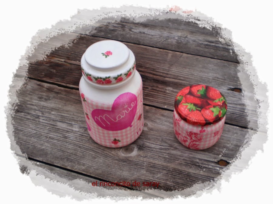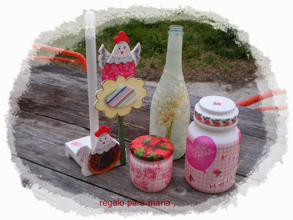 Ella este año en los cumples de sus amigas quería hacerles un regalo que no fuero lo de siempre y me pidió ayuda . Como le gusto mucho el porta rollos que le hice a Marisa , quiso hacerle ella uno a su amiga María, lo acompaño con unos botes muy coloridos y una botella .