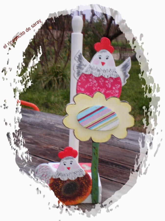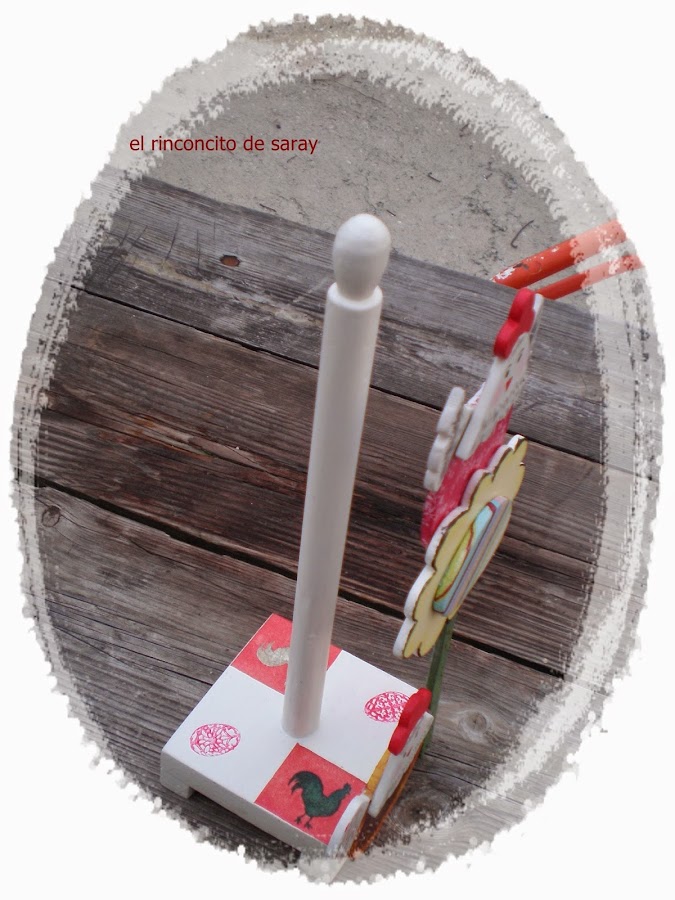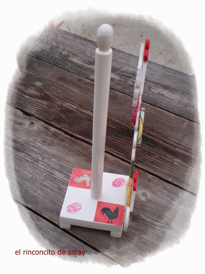 La base del porta rollos la hizo nuestro padre hasta el palito donde va el papel . las gallinas las corto ella misma yo le pegue la servilleta .