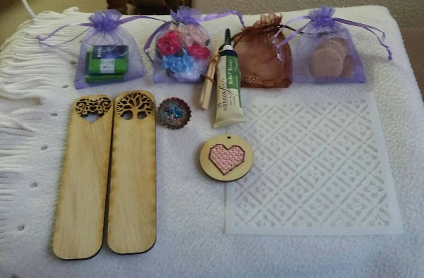 Flores de tela, plantilla de stencil, separadores de libro, pintura azul 3D. Un precioso corazón bordado por ella que me encanta, ..........