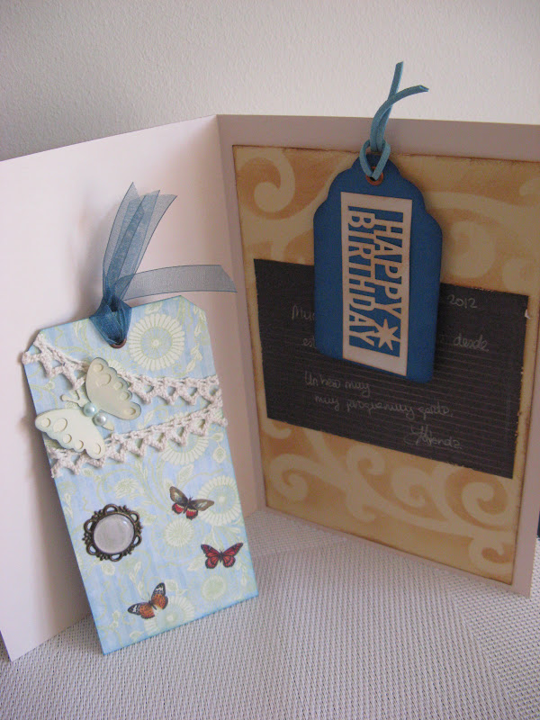 I a la part interior de la tarjeta Un tag i la felicitació i també un marcapagines o tag , decorat amb uns colors molt suaus i amb une spapellones precioses.