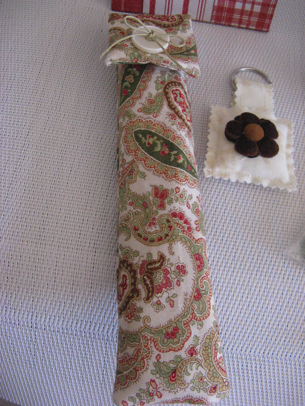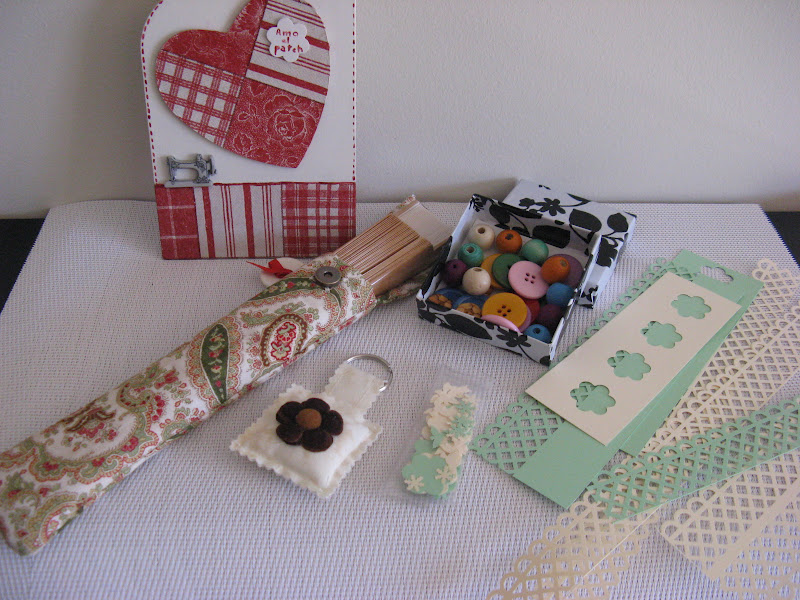 Aqui teniu tots els regalets; botons, diferents troquels de scrap i aixó que es veu al fons amb aquest cort vermells es patch amb decoupages I es un cartellet per penjar a la porta del meu cuarto de costura.....cachis veig que la foto ha quedat una mica tallada.
